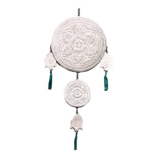 Añade un toque de magia balinesa y frescura a tu hogar con este encantador móvil decorativo de aluminio pintado a mano en colores pastel.
