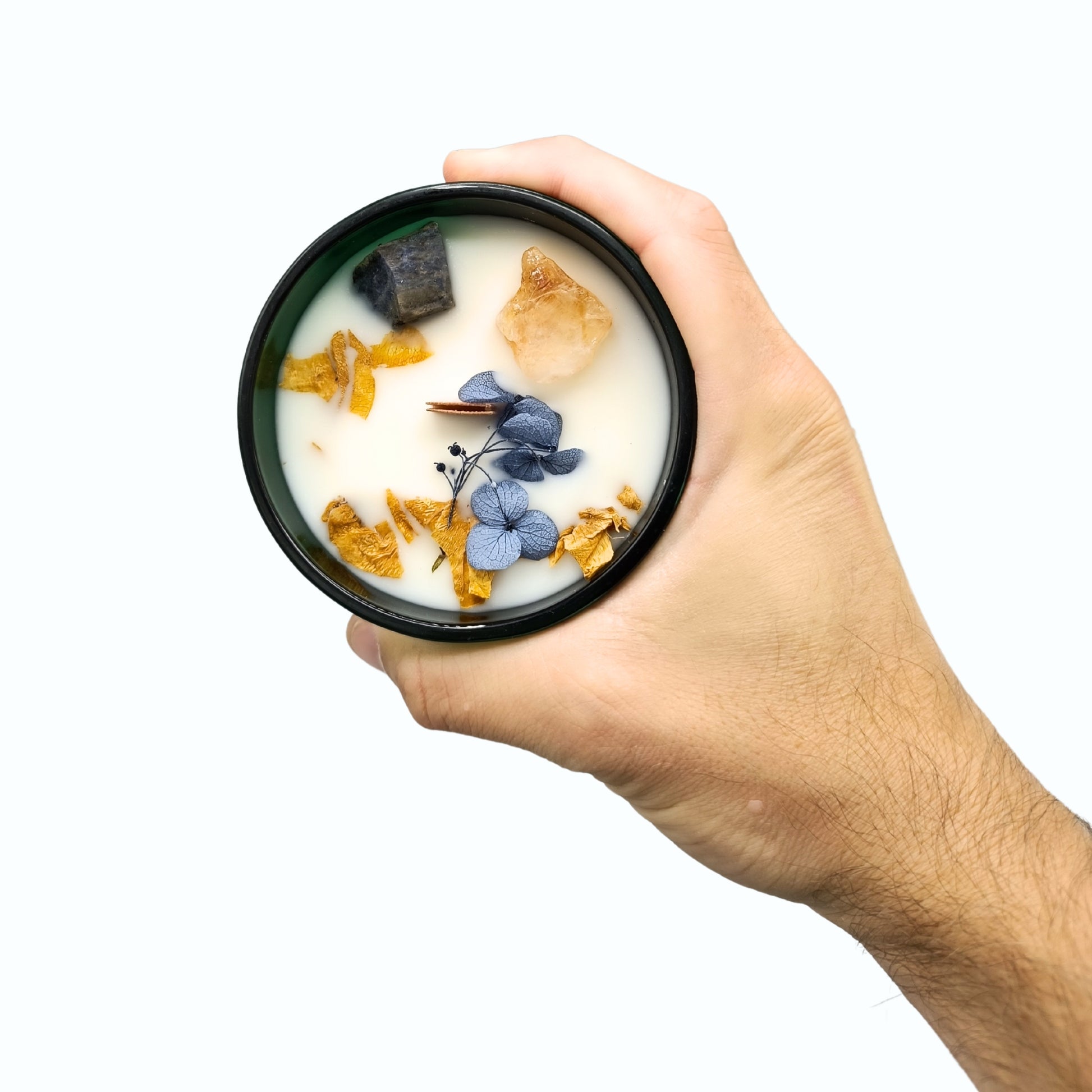 Potenciada por las gemas de citrino y sodalita, esta vela irradia positividad. El citrino, conocido como la "piedra del éxito", se combina con la energía armonizadora de la sodalita para generar un espacio lleno de optimismo y alegría.